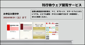 | ------------------------------------------------------------------ ◎ 刊行物ウェブ閲覧サービスお申込み受付中 主要な構造設計指針類を、PC、タブレット、スマートフォンからいつでも、どこでも閲覧・テキスト検索できます(年間契約)。ぜひご利用ください。 ・申込受付期間:2024年8月1日(木)〜 31日(土) ・閲覧可能期間:2024年10月1日(火)〜 2025年9月30日(金) ![]() ※お申し込みは、こちら(もしくは、画像をクリック) |